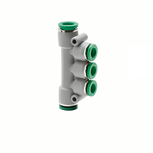The Pneumax T18-08-06 is a multi-port tee fitting designed for pneumatic systems requiring balanced flow distribution across 8mm and 6mm tubing net...